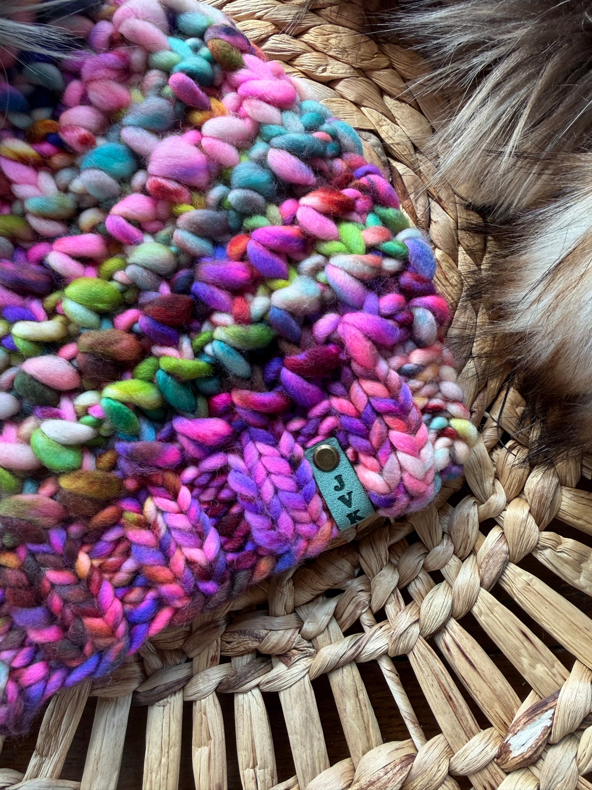 Materials/May Contain: 100% Merino Wool, faux fur pom pom, wood button, cord lock, faux leather or utrasuede tag, antique brass screw