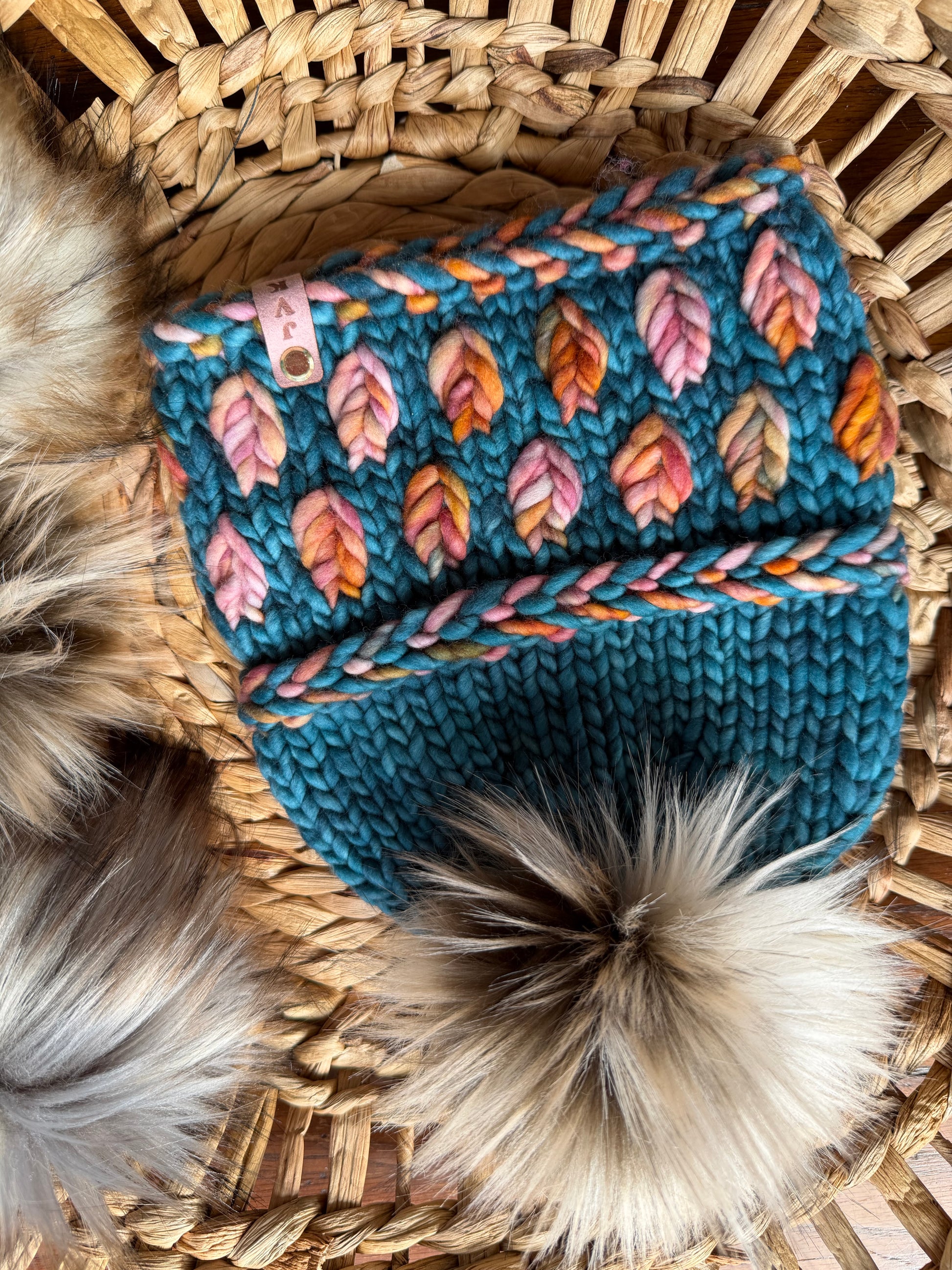 Materials/May Contain: 100% Merino Wool, faux fur pom pom, wood button, cord lock, faux leather or utrasuede tag, antique brass screw
